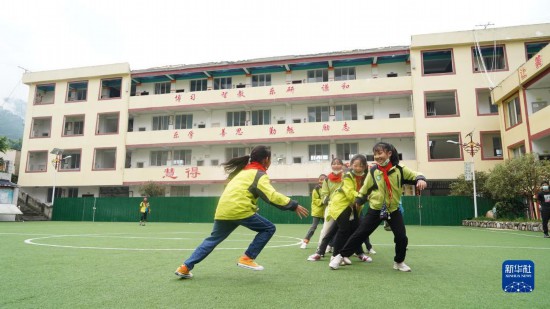 9月14日,学生在泸定县得妥镇中心小学参加课间活动。