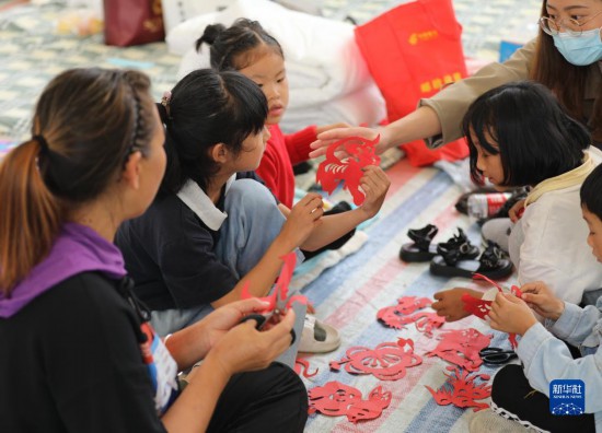 9月14日,在石棉县王岗坪乡,老师在国家能源集团大渡河大岗山公司提供的场地教学生剪纸。