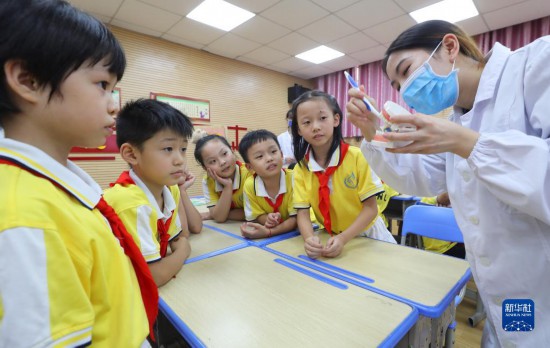 9月19日,在湖南省衡阳市雁峰区环城南路小学,南华大学衡阳医学院口腔专业的大学生志愿者在指导孩子们用正确的方式刷牙。