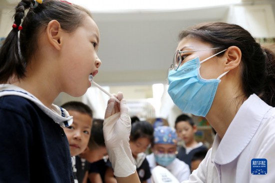 9月19日,在江苏省连云港市核电钟声国际幼儿园,医务人员给小朋友们检查牙齿健康状况。