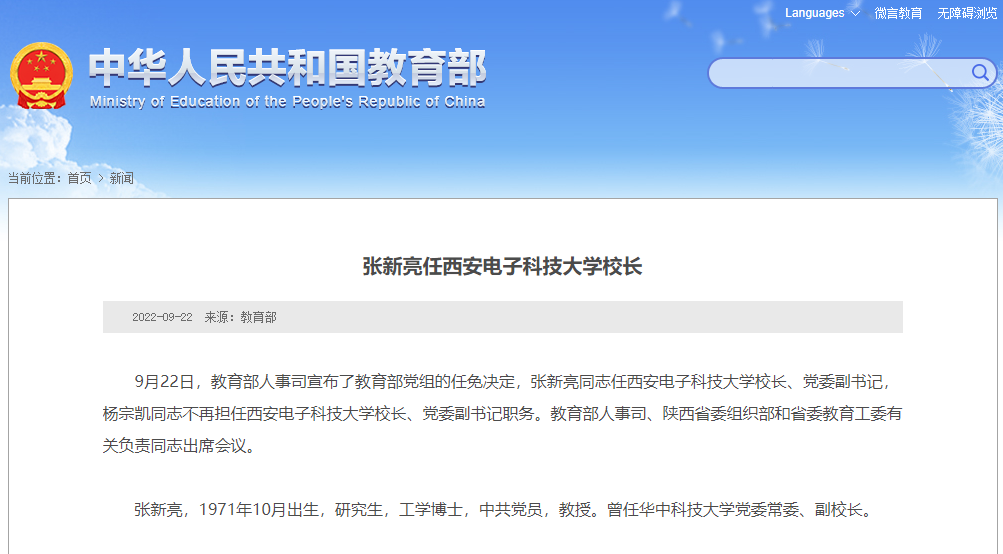 伟德国际1946bv官网北京9月22日电 (记者何淼)教育部人事司今日宣布了教育部党组的任免决定,张新亮同志任西安电子科技大学校长、党委副书记,杨宗凯同志不再担任西安电子科技大学校长、党委副书记职务。教育部人事司、陕西省委组织部和省委教育工委有关负责同志出席会议。