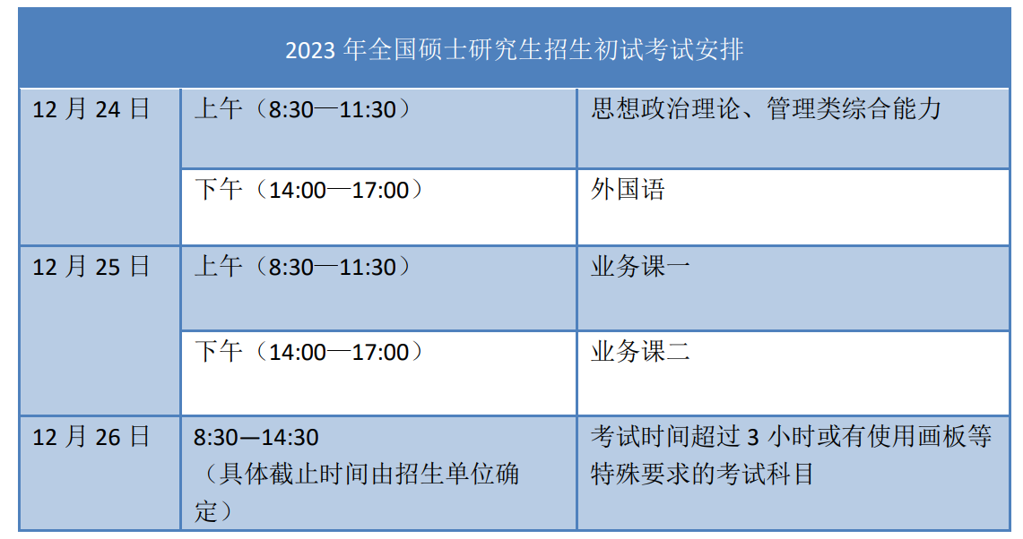 2023年全国硕士研究生招生考试初试时间为2022年12月24日至25日(每天上午8:30—11:30,下午14:00—17:00)。超过3小时的考试科目在12月26日进行(起始时间8:30,截止时间由招生单位确定,不超过14:30)。