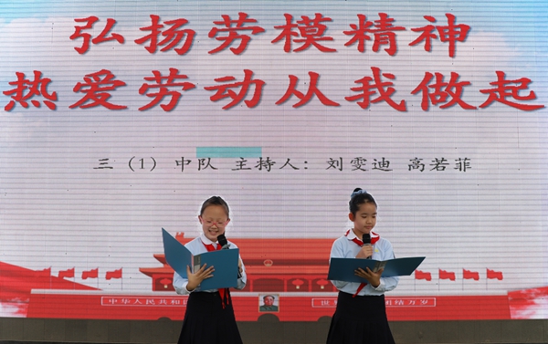 在活动现场,少先队员们通过升国旗仪式、团员老师讲党史、观看主题视频、主题朗诵等多种方式,向全校师生介绍了劳模榜样的事迹、分享劳动妙招和感悟。在场的同学们对劳动、劳动的重要性、劳模精神有了更新的认识和理解——“劳模故事让我很感动”、“作为一名小学生,我要从点滴做起,学习好生活本领,热爱劳动从我做起”……