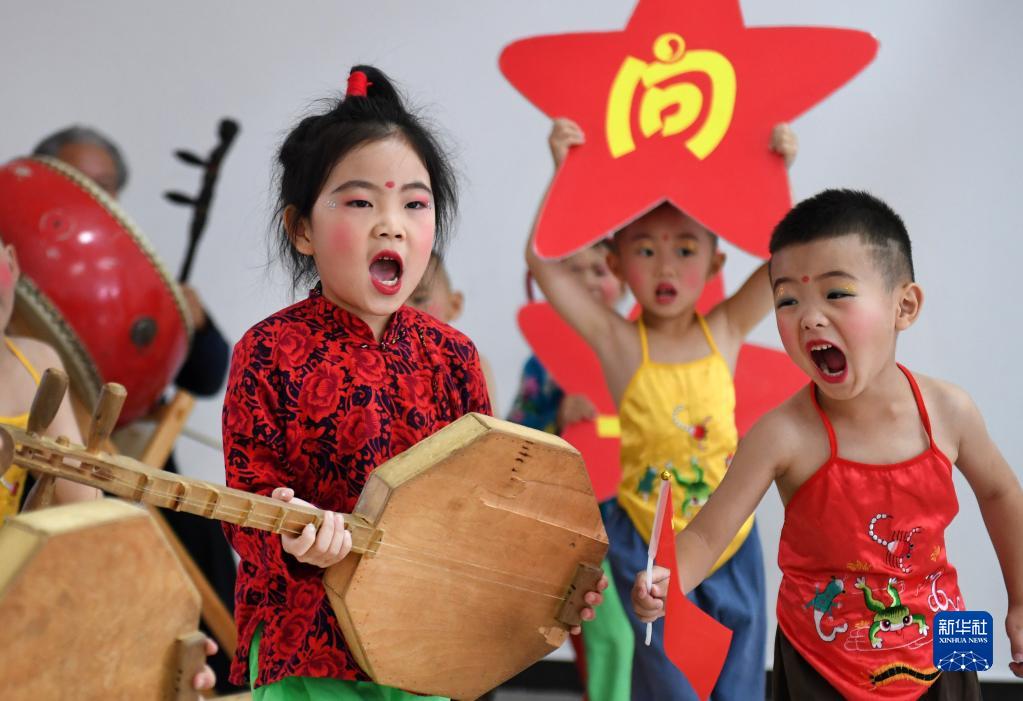 潼关县城关北区幼儿园的孩子们表演“黄河老腔”(9月27日摄)。