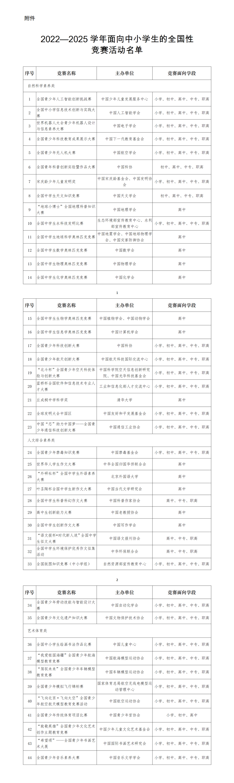 图为2022—2025学年面向中小学生的全国性竞赛活动名单。