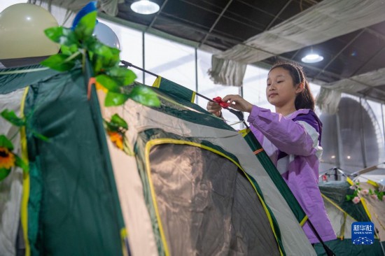 10月5日,在天华百卉园内,小朋友在布置帐篷。