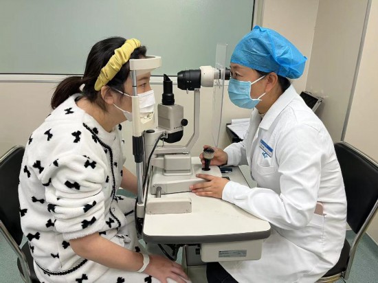 10月13日,青海省人民医院眼科副主任医师张晓英(右)在为患者做检查。(受访者供图)