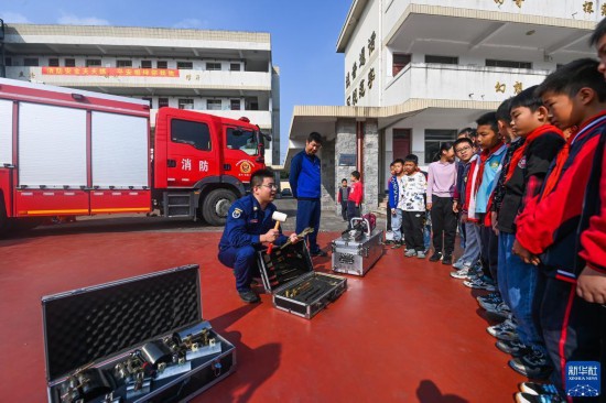 11月8日,东林镇消防队员在给东林小学的学生们讲解各类消防器材的使用知识。