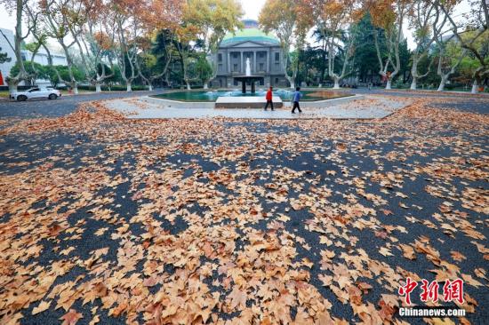 东南大学四牌楼校区内的梧桐树落叶铺满道路。中新社记者 泱波 摄
