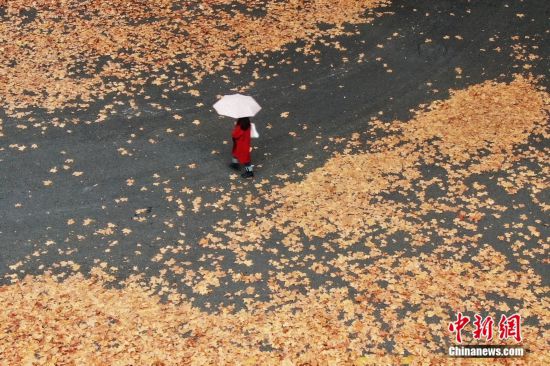 东南大学学生从落叶铺地的校园走过。(无人机照片)中新社记者 泱波 摄