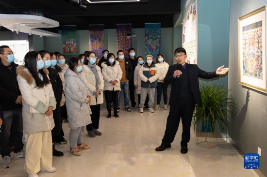 12月4日,江苏省南京市六合区农民画美术馆内,一场以江苏省非物质文化遗产六合农民画为载体的党的二十大精神宣讲会举行。这是六合区冶山街道文体服务中心主任胡斌(右一)带领参加活动的基层干部群众参观农民画。新华社发 (张梦 摄)