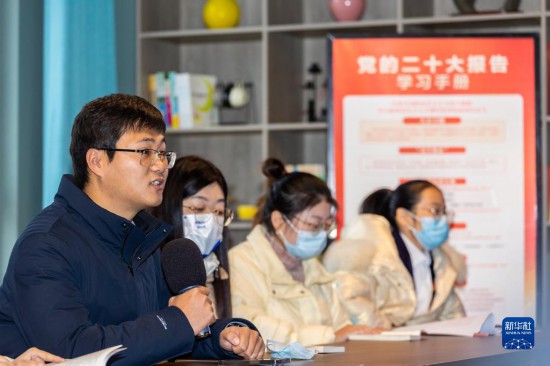 12月4日,江苏省南京市六合区农民画美术馆内,一场以江苏省非物质文化遗产六合农民画为载体的党的二十大精神宣讲会举行。这是冶山街道双墩村党总支书记耿云松(左一)在发言。新华社发(张梦摄)
