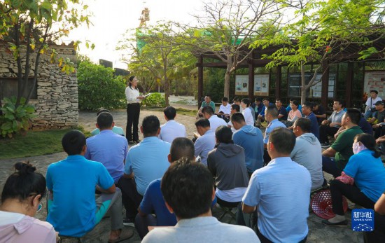 11月17日,党的二十大代表、海南陵水黎族自治县文罗镇副镇长、五星村党总支书记黄丽萍在三沙市赵述岛宣讲党的二十大精神。新华社发(吴亚铁摄)