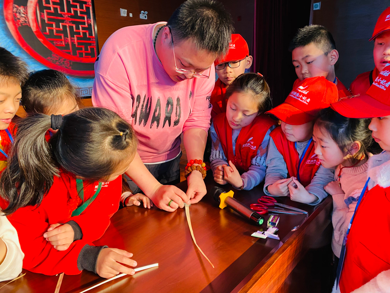 图为郭畅旭在教小学生制作麦秆画。受访者供图