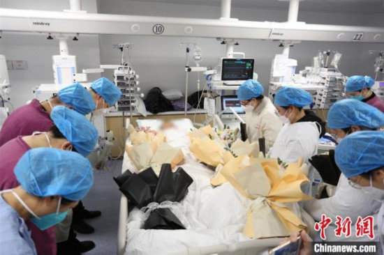 图为捐献者离开ICU病房前,科室医生及其生前同学老师向其默哀致敬。 广西医科大学第二附属医院供图