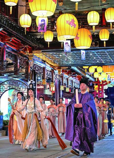 上海豫园内上演国风主题表演“仲秋月神游”。新华社发