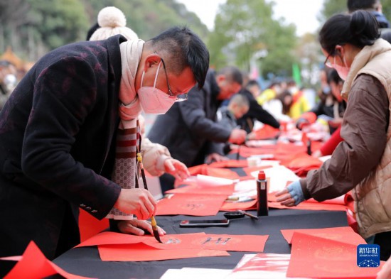 春节临近,多地组织书法志愿者走进社区、工地等场所,为人们书写春联和福字,迎接春节的到来。