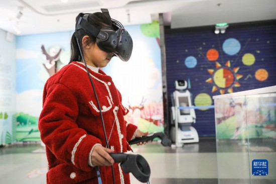 1月17日,一名小朋友在河南省宝丰县科技馆体验VR游戏。