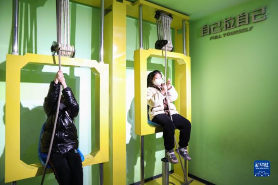1月17日,两名小朋友在河南省宝丰县科技馆体验“自己拉自己”器材。
