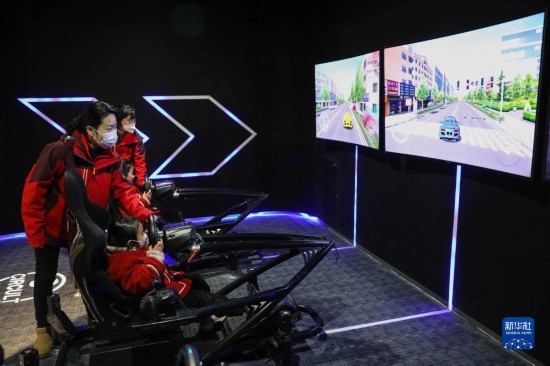 1月17日,在河南省宝丰县科技馆,两名小朋友在工作人员的帮助下体验“赛道英雄”游戏。