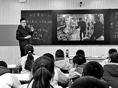 2022年3月23日,大学生志愿者与陕西省合阳县坊镇中心小学的学生一起观摩“天宫课堂”。新华社发