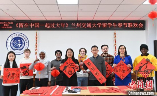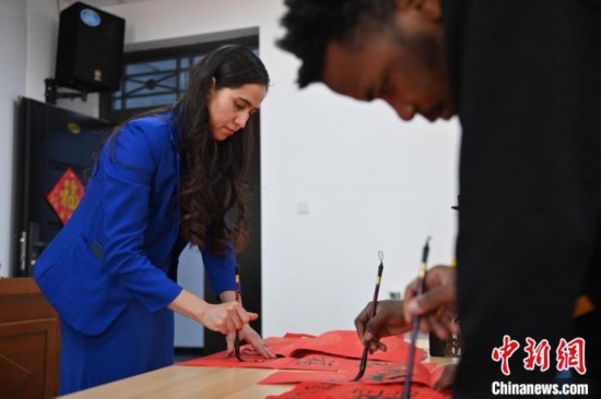 1月21日,农历除夕,兰州交通大学留学生在校内参加“留在中国一起过大年”春节联欢会,写春联、福字。 李亚龙 摄