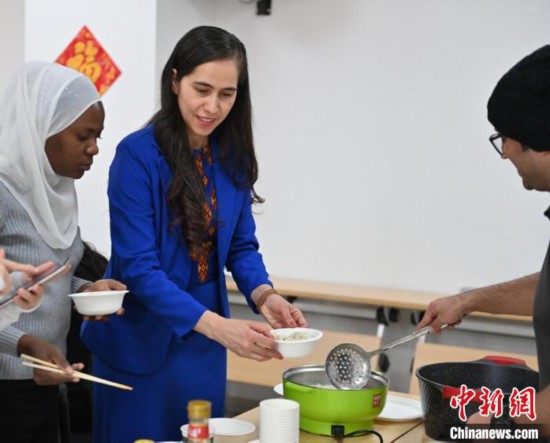 今年春节,加汉(着蓝色衣服者)和留学生一起包饺子、煮饺子。 李亚龙 摄