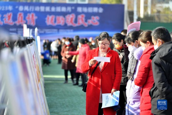 1月31日,求职者在湖北省襄阳市保康县2023年春风行动暨就业援助月现场招聘会上了解岗位信息。新华社发(杨韬摄)