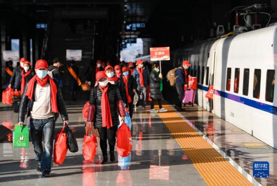 1月30日,在重庆西站,乘坐2023年重庆首趟务工定制专列的旅客来到站台准备登车。新华社记者 王全超 摄