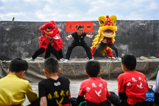 2月2日,在广西兴业县石南镇东周村,教练在传授舞狮的基本功。