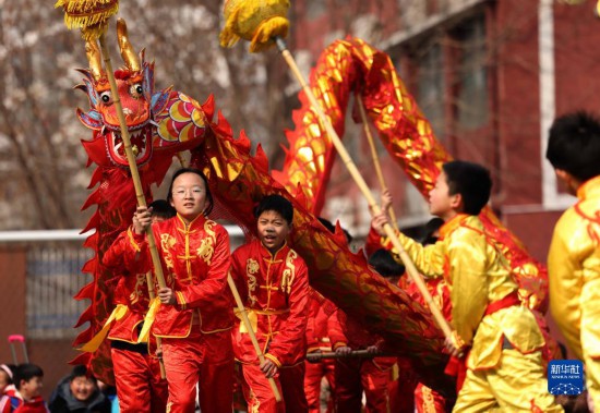 2月5日,在合肥市蚌埠路第二小学,孩子们表演舞龙。
