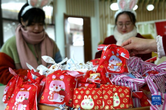 2月9日,福建武夷山百花幼儿园的老师们为孩子们准备兔年福袋。