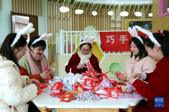 2月9日,福建武夷山百花幼儿园的老师们为孩子们准备兔年福袋。