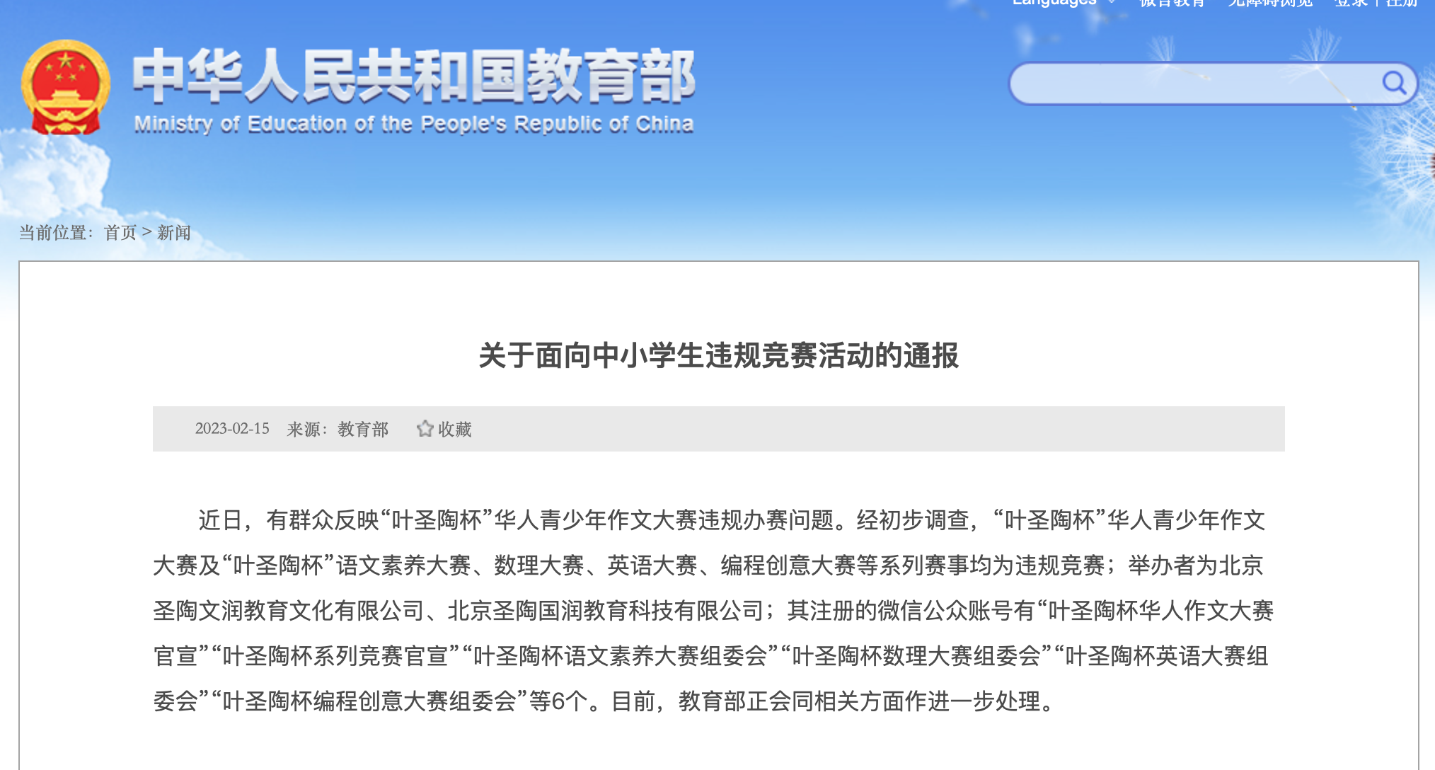 教育部通报:“叶圣陶杯”系列赛事均为违规竞赛