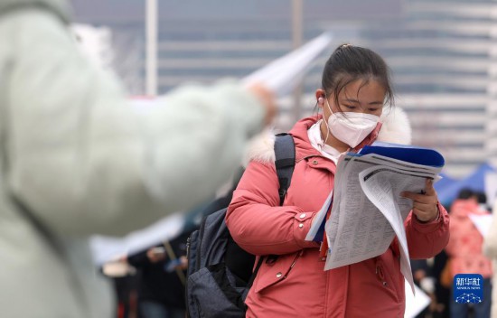2月18日,在河北省艺术中心文化广场,求职者在翻阅招聘信息,寻找工作机会。
