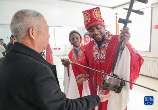 2月17日,在山东省临沂市兰山区枣园镇弦子戏非遗展厅,外国留学生在民间艺人的指导下体验二胡演奏。