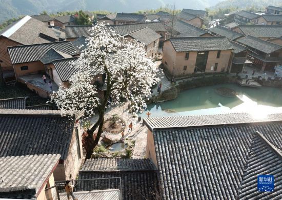 2月18日,游客在浙江省义乌市杨盆村的白玉兰树下游玩赏花。