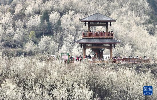2月18日,游客在广西柳州市鹿寨县导江乡山楂林中赏花休闲(无人机照片)。