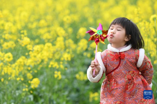 2月19日,一名小朋友在贵州省余庆县白泥镇满溪村的油菜花田间玩耍。
