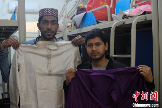 图为两名孟加拉国籍留学生正在展示自己的传统服饰。刘俊聪 摄