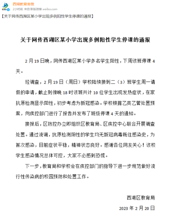 伟德国际1946bv官网北京2月20日电 (记者孙竞)2月19日晚,网传杭州某小学多名学生阳性,下周该班停课4天。今天上午,杭州市西湖区教育局通过“西湖教育官微”发布通报。