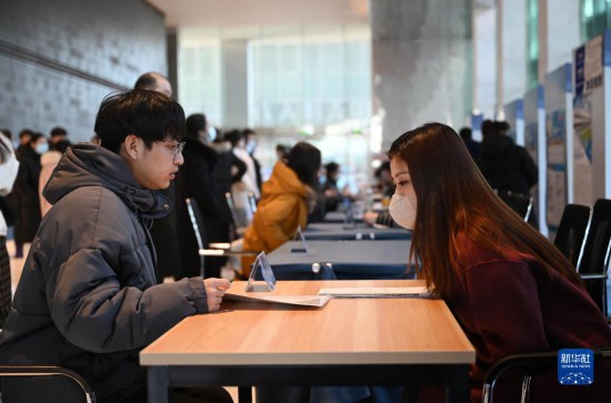 2月19日,在天津经济技术开发区春季促就业暖心行动公益现场招聘会,招聘企业工作人员与求职者交流。新华社记者 赵子硕 摄