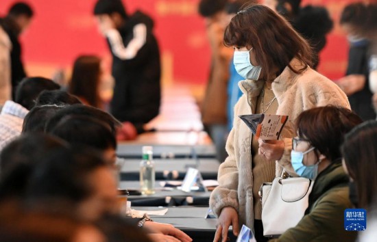 2月19日,在天津经济技术开发区春季促就业暖心行动公益现场招聘会,招聘企业工作人员与求职者交流。新华社记者 赵子硕 摄
