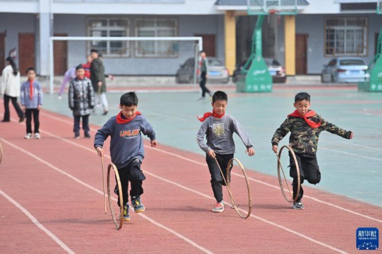 2月22日,广西蒙山县夏宜民族学校学生在体育课上滚竹环。
