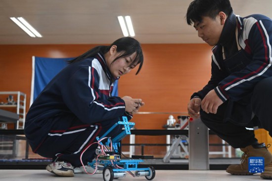 2月23日,西宁果洛中学学生在机器人教室内操作自己组装的机器人。
