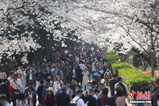 原标题:武汉大学对社会公众开放赏樱首日 樱花树下人潮涌