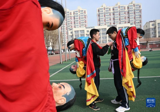 3月20日,隆化县职教中心学生在练习国家级非遗项目“二贵摔跤”前互相整理衣物。