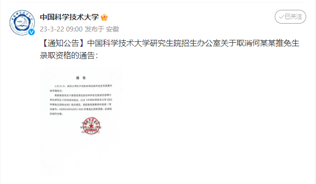 有网友发现,何某某此前已获得中国科学技术大学拟接收保研生资格。中国科大根据教育部关于推荐优秀应届本科毕业生免试攻读硕士学位研究生工作的相关规定,以及《中国科学技术大学2023年推免生接收办法》相关规定,作出上述决定。