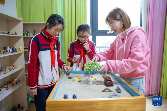 3月22日,宁波市江北区洪塘实验学校的心理教师在心理辅导室陪学生一起摆放沙盘。