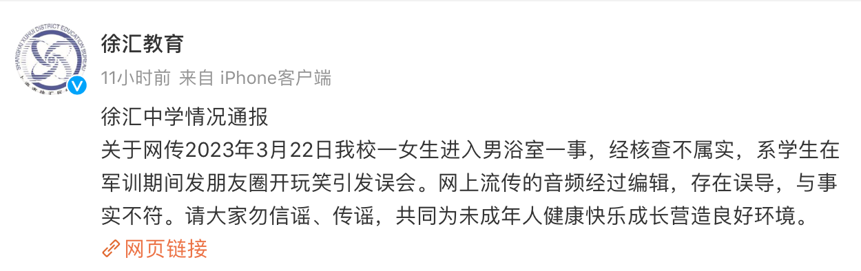 上海徐汇中学女生进男浴室偷拍?教育局回应:经核查不属实